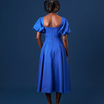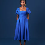 Midi pleat dress with puff sleeves and sqaure neckline