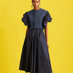 Denim crop top with gathered puff sleeves, frayed hem and front zipper