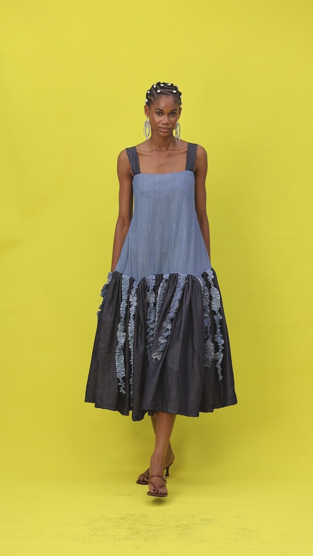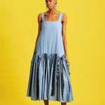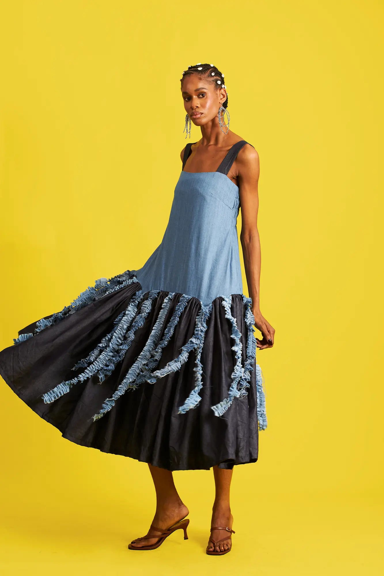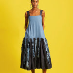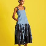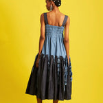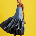 Sleeveless midi dress with gathered drop waist and distressed denim tassels