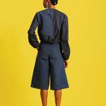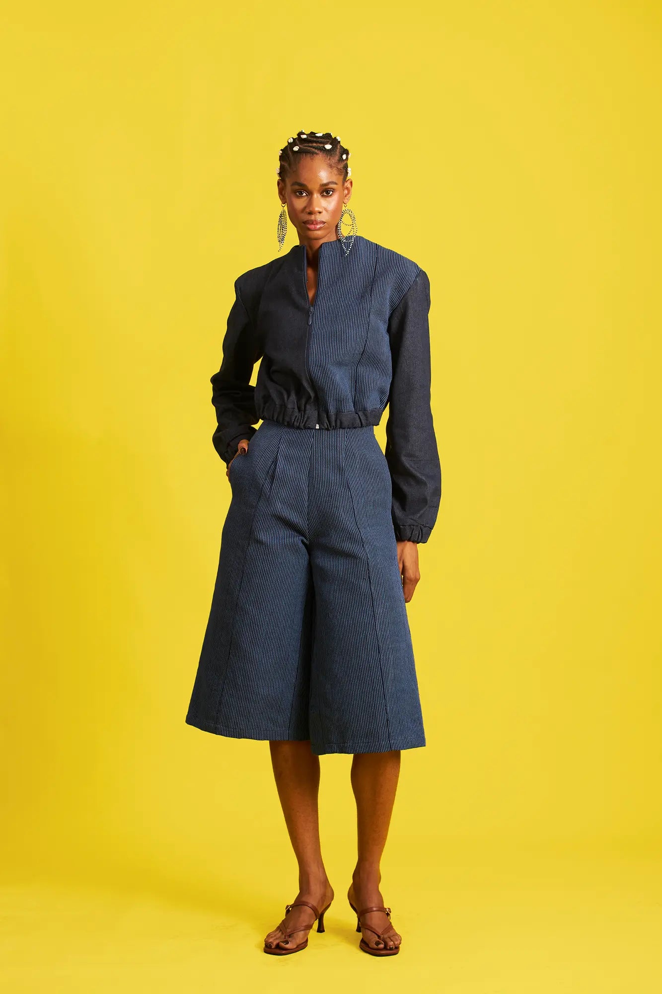 Long sleeve contrast bomber jacket with front zipper & A-line shorts aso oke with side pockets