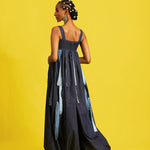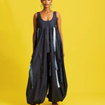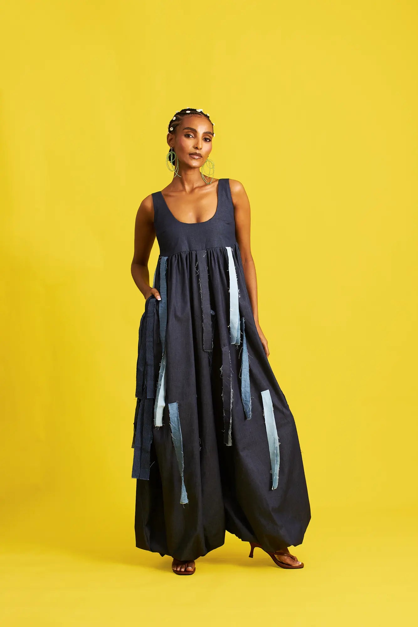 Sleeveless bubble hem jumpsuit with empire waist, aso oke and denim tassels